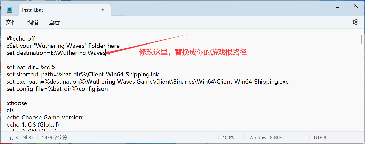 1.找到你鸣潮游戏根路径,复制路径。2.解压压缩包里面的文件,右击以文本方式打开“Install.bat”文件,用你复制的游戏根路径替换以下位置并且保存:3.双击运行Install.bat(一定要双击运行,不可管理员方式运行),选择你对应的服务器,1为国际服,2为国服,3为B服。4.如果你需要卸载mod文件残留,同理修改Uninstall.bat路径,并且双击运行即可