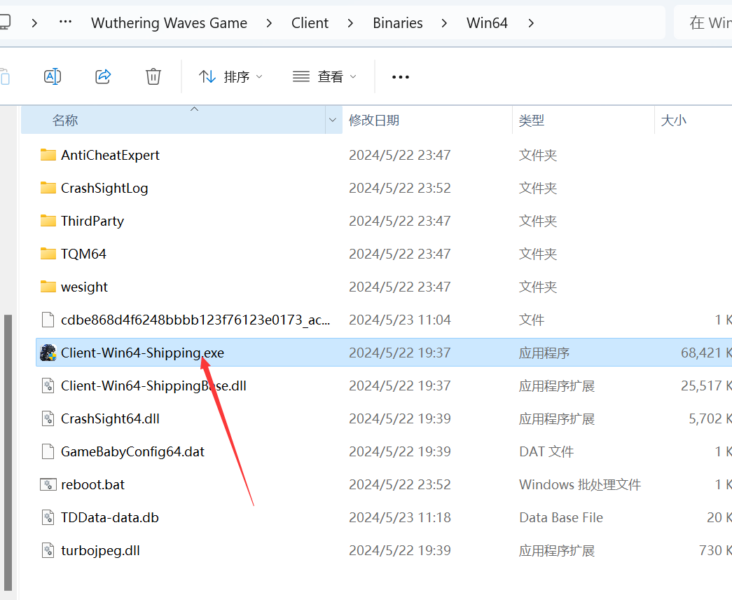 选择E:\Wuthering Waves\Wuthering Waves Game\Client\Binaries\Win64\Client-Win64-Shipping.exe 具体看你自己安装的游戏路径